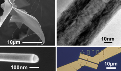 in its ground state of motion, i.e. at lowermost kinetical In order to be able to control and manipulate the nanotube vibration, we have built up techniques to couple suspended nanotube quantum dots to superconducting coplanar microwave resonators [6-9]. With that, we have been able to demonstrate optomechanical coupling of the microwave field and the vibration, strongly enhanced by the quantization of the electric charge [9]. Now, we intend to build on these results and extend them, making CNTs a unique system where single electron tunneling, discrete well-defined electronic states, and microwave opto- mechanics coherently interact. The quantum dot – microwave cavity combination is a highly versatile tool with large potential for further improvement, as truly quantum-mechanical NEMS system and "switchboard" for quantum information. transition metal dichalcogenide nanotubes as semiconductors and superconductors